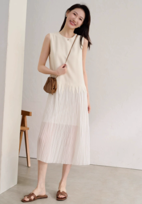 • 狠仙美 空灵氧气感 醋酸拼接网纱百褶设计感背心连衣裙
