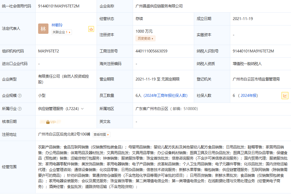 广州昌盛供应链服务有限公司成立于2021年11月19日,注册地址为广州市白云区后岗北街2号106铺,经营范围包括日用品批发;鞋帽零售;家居用品销售;办公用品销售;体育用品及器材批发;文具用品批发;文具用品零售;办公设备耗材销售;厨具卫具及日用杂品批发;厨具卫具及日用杂品零售钟表销售;服装服饰零售;服装服饰批发;家用电器零配件销售;美发饰品销售;家用电器销售;电子产品销售;皮革制品销售;个人卫生用品销售;电子元器件零售;化妆品批发;化妆品零售;日用杂品销售;箱包销售;针纺织品销售;;日用百货销售;